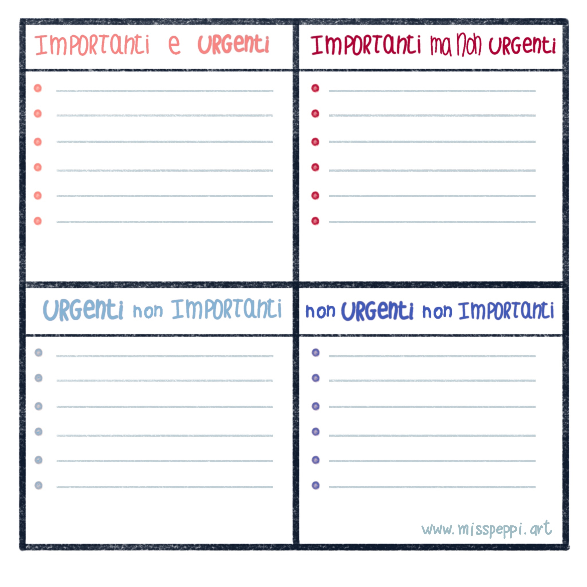 All’interno di ogni quadrante mi scrivo le cose che ho da fare durante la giornata dividendole per categorie. Sinceramente non sempre ci riesco, ma spesso tento di farla e quando uso la Matrice il mio tempo è organizzato meglio e soprattutto comincio a dire “No!” a chi non rispecchia determinati canoni e, per quanto bello sia aiutare, ho dovuto cominciare ad aiutare me, da sola.